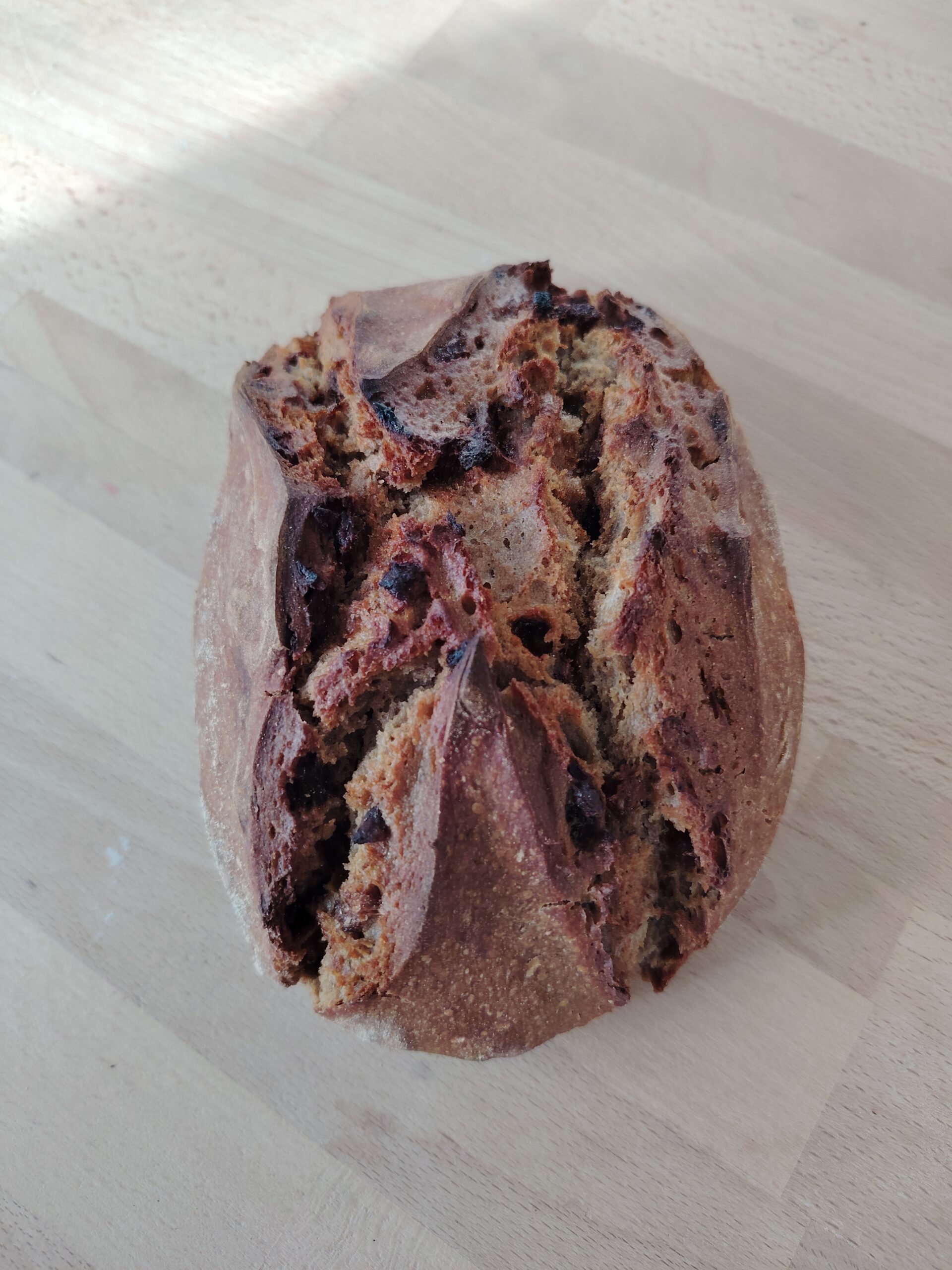 Pain sur base de T80, farine de châtaigne, levain de blé, sel, abricots.